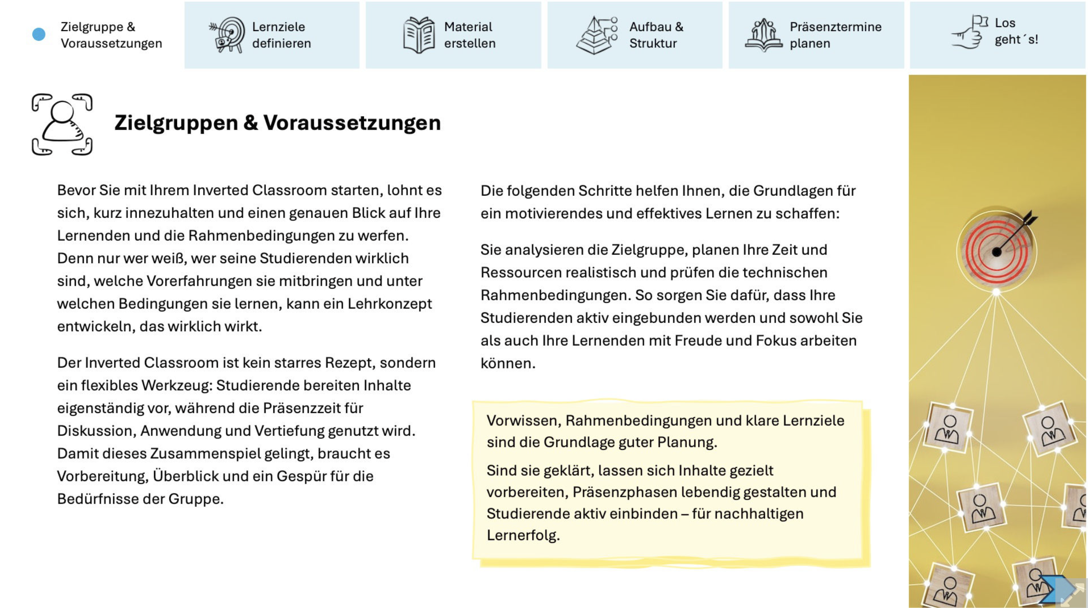 Das Ziel ist, dass Studierende das Konzept verstehen, sich selbstständig vorbereiten können und aktiv in den Lernprozess eingebunden werden. So gelingt ein effektiver Inverted Classroom, der sowohl die Lernenden unterstützt als auch die Präsenzzeit optimal nutzt.