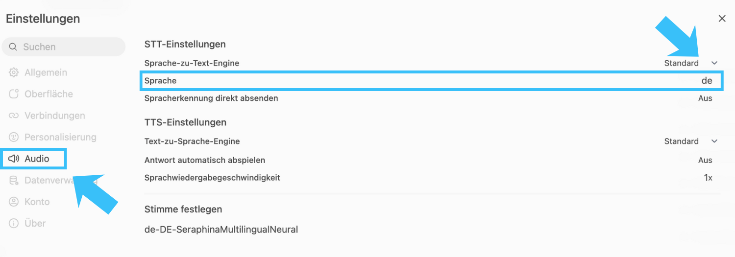Vorlesen: Unabhängig davon in welchem Modus Sie eine Konversation begonnen haben (Text, Diktieren, Sprachmodus), können Sie immer das Vorlesen aktivieren und deaktivieren, indem Sie auf das Lautsprechersymbol unter der KI-Ausgabe klicken.