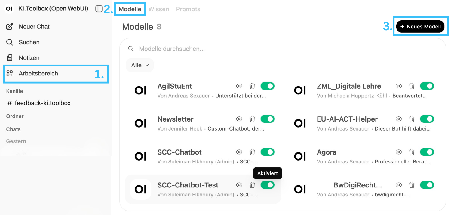So legen Sie ein eigenen eigenen Assistenten an: Navigieren Sie über das linke Hauptmenü zu "Arbeitsbereich" > "Modelle". Über den Button "+ Neues Modell" können Sie ein neues Modell anlegen.